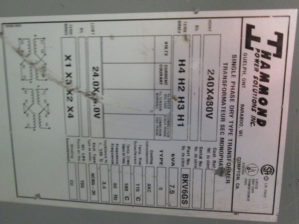 Hammond Transformer BKV6GS 7.5KVA Pri 240x480V Sec 24x48V 1Ph ...