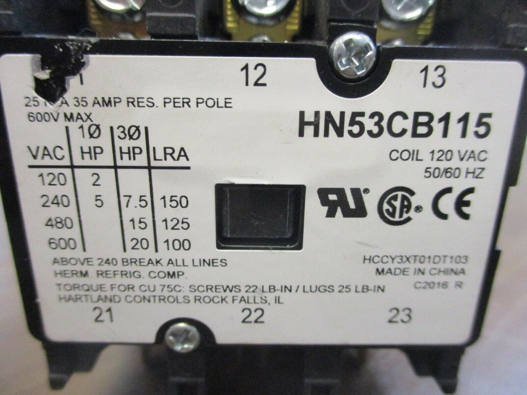 Hartland Controls Contactor HN53CB115 120V Coil 25A 600V Used