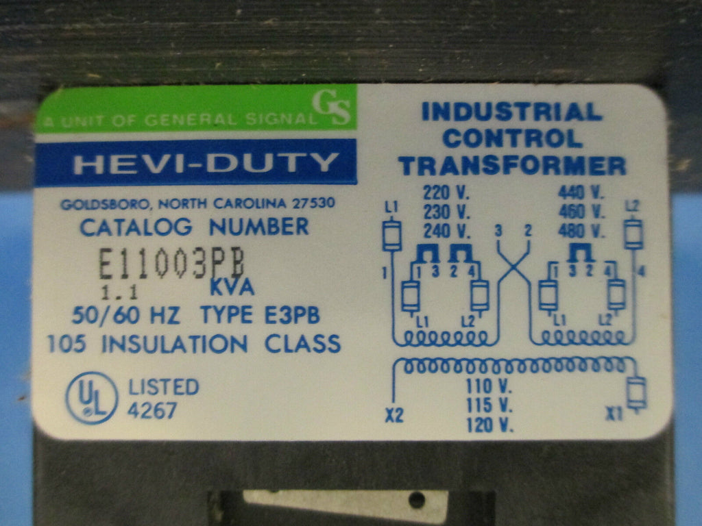 Hevi-Duty Transformer E11003PB 1.1KVA Pri 240/480V Sec 120V Used