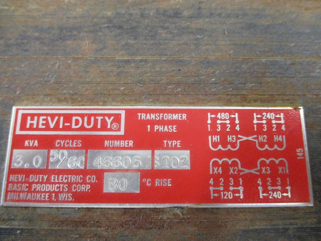 Hevi-Duty Type SIOZ Transformer 46605 3 KVA Pri : 240/480 Sec:...