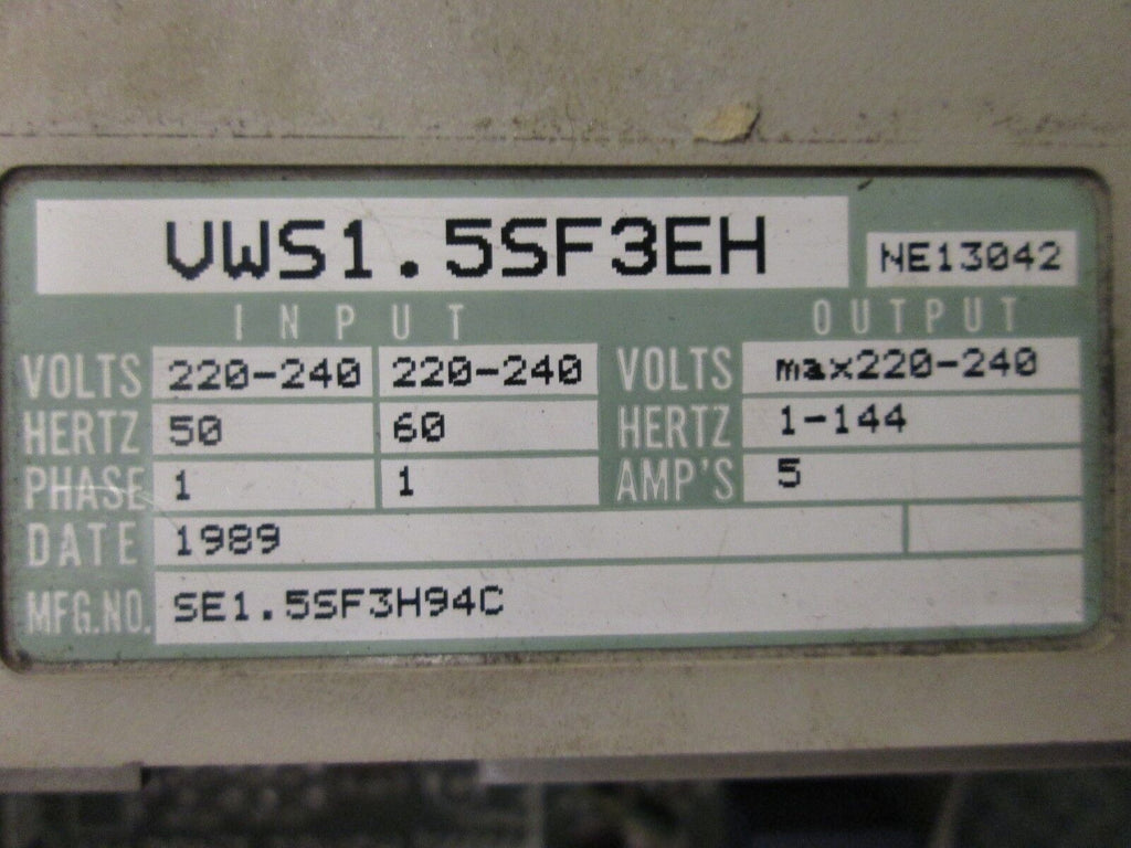 Hitachi AC Drive VWS1.5SF3EH 1HP Used Condition: UsedBrand: HitachiModel: AC DriveMPN: VWS1.5SF3EH Hitachi AC Drive VWS1.5SF3EH 1HP Used Hitachi AC Drive Part # VWS1.5SF3EH 1HP Input: 220-240V, 50/60Hz, 1Ph, Output: 220-240V, 1-144Hz, 5AUsedLOC: 23B4-1 Hitachi AC Drive Part # VWS1.5SF3EH 1HP Input: 220-240V, 50/60Hz, 1Ph, Output: 220-240V, 1-144Hz, 5A Uséd LOC: 23B4-1