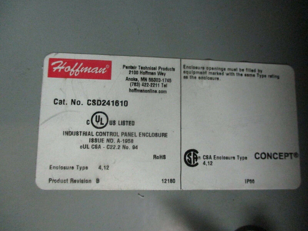 Hoffman Concept Type 4, 12 Enclosure CSD241610 Size: 24x16x10" Used_x000D_ Condition: UsedType: EnclosureColor: GrayMPN: CSD241610Box Shape: RectangularBrand: Hoffman Hoffman Concept Type 4, 12 Enclosure CSD241610 Size: 24x16x10" Used Hoffman Concept Type 4, 12 Enclosure Part #: CSD241610 Size: 24x16x10" UsedLOC AB9P4-3 / AB2M4 Hoffman Concept Type 4, 12 Enclosure Part #: CSD241610 Size: 24x16x10" Uséd LOC AB9P4-3 / AB2M4