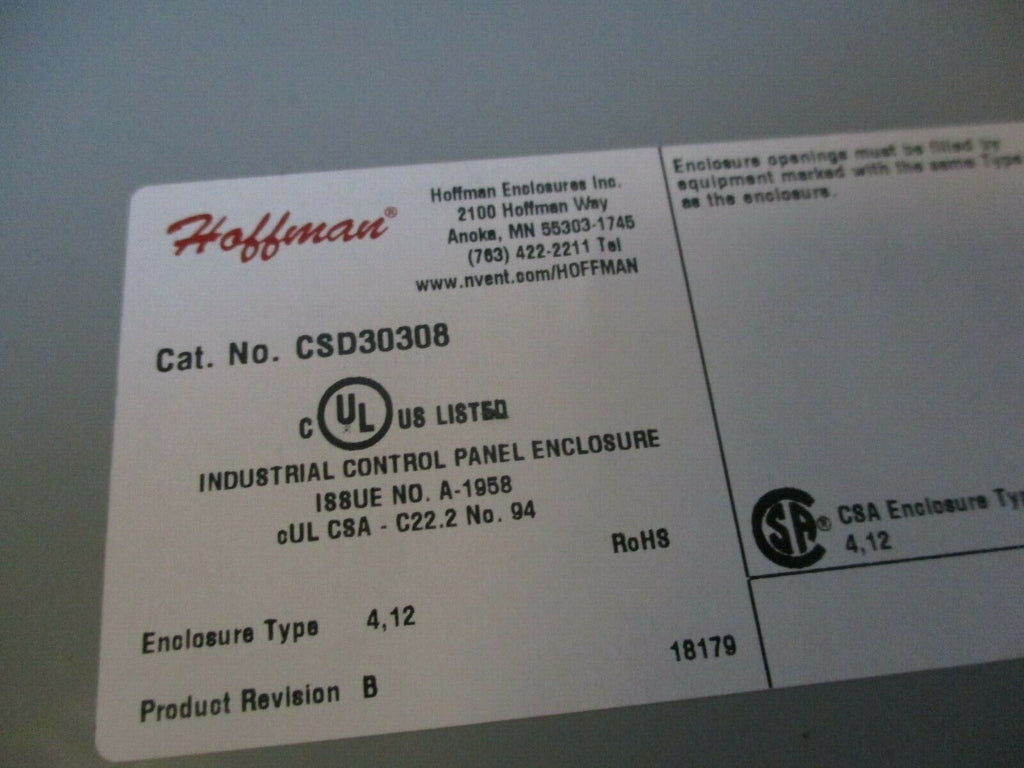 Hoffman Type 4, 12 Enclosure CSD30308 Size: 30x30x8" Used Condition: UsedMPN: CSD30308Brand: Hoffman Hoffman Type 4, 12 Enclosure CSD30308 Size: 30x30x8" Used Hoffman Type 4, 12 Enclosure Part #: CSD30308 Size: 30x30x8" UsedWeight: 86 lbsLOC AB12D1-2 Hoffman Type 4, 12 Enclosure Part #: CSD30308 Size: 30x30x8" Uséd Weight: 86 lbs LOC AB12D1-2