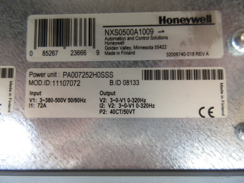 Honeywell AC Drive Part #: PA007252H0SSS 50 HP 3Ph Input: 380-500 V 50/60 Hz 72 A Output: 0-V1 0-320 Hz w/ Keypad *Missing (3) Cover Screws* Used Loc: AB11-9145 / AB31D2