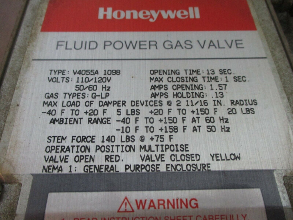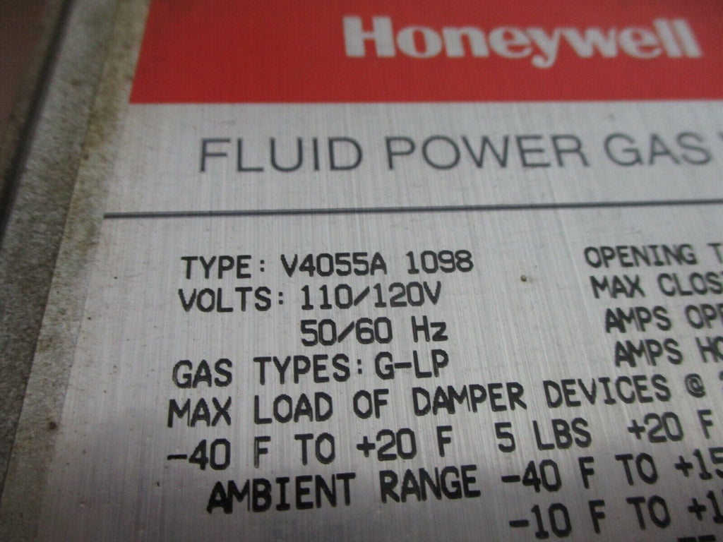 Honeywell Fluid Power Gas Valve V4055A 1098 110/120V 50/60Hz Gas Types: G-LP Condition: UsedMPN: V4055A 1098Brand: Honeywell Honeywell Fluid Power Gas Valve V4055A 1098 110/120V 50/60Hz Gas Types: G-LP Honeywell Fluid Power Gas Valve Part#: V4055A 1098 110/120 V 50/60Hz Gas Types: G-LP Opening Time: 13 Sec Closing Time: 1 Sec Nema 1 Enclosure Used Loc: AB11-2753 / AB13O4 Honeywell Fluid Power Gas Valve Part#: V4055A 1098 110/120 V 50/60Hz Gas Types: G-LP Opening Time: 13 Sec Closing Time: 1 Sec Nema 1 Enclosure Uséd Loc: AB11-2753 / AB13O4