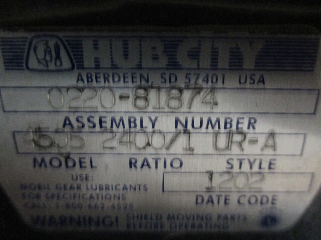 Hub City Worm Gear Reducer w/ Motor 0220-81874 Model 4505 Ratio: 2400/1 Used Condition: UsedBrand: Hub CityMPN: 0220-81874 Hub City Worm Gear Reducer w/ Motor 0220-81874 Model 4505 Ratio: 2400/1 Used Hub City Worm Gear Reducer w/ MotorPart #: 0220-81874 Model 4505 Ratio: 2400/1 UR-A StyleMotor: ½HP , 1725 RPMUsedWeight: 261 lbsLOC AB4I4-2 Hub City Worm Gear Reducer w/ Motor Part #: 0220-81874 Model 4505 Ratio: 2400/1 UR-A Style Motor: ½HP , 1725 RPM Uséd Weight: 261 lbs LOC AB4I4-2