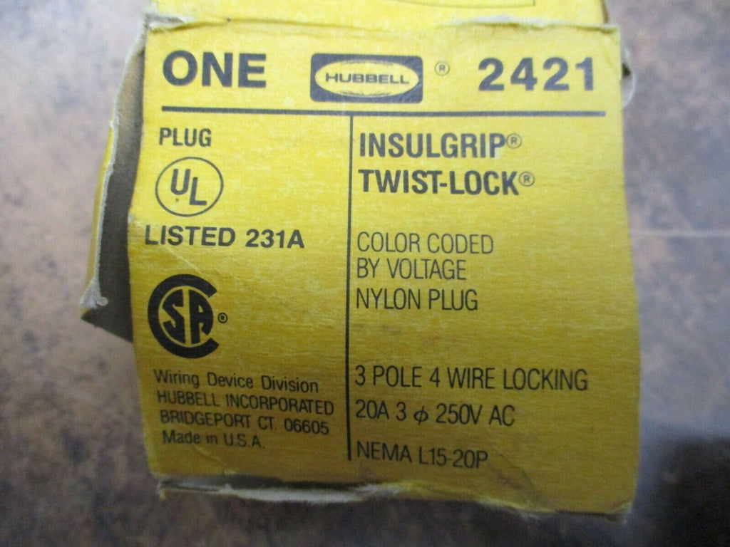 Hubbell Insulgrip Twist-Lock Plug 2421 20A 250V 3Ph New Surplus Condition: New – Open boxBrand: HubbellType: Electrical PlugMPN: 2421 Hubbell Insulgrip Twist-Lock Plug 2421 20A 250V 3Ph New Surplus Hubbell Insulgrip Twist-Lock Plug Part #: 2421 20A 250V 3Ph New SurplusLOC 13D4-40 Hubbell Insulgrip Twist-Lock Plug Part #: 2421 20A 250V 3Ph New Surplus LOC 13D4-40