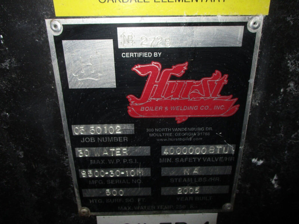 Hurst Series 500 Firetube Boiler 100HP 500 SQ FT Heating Surface MFD 2005 Used