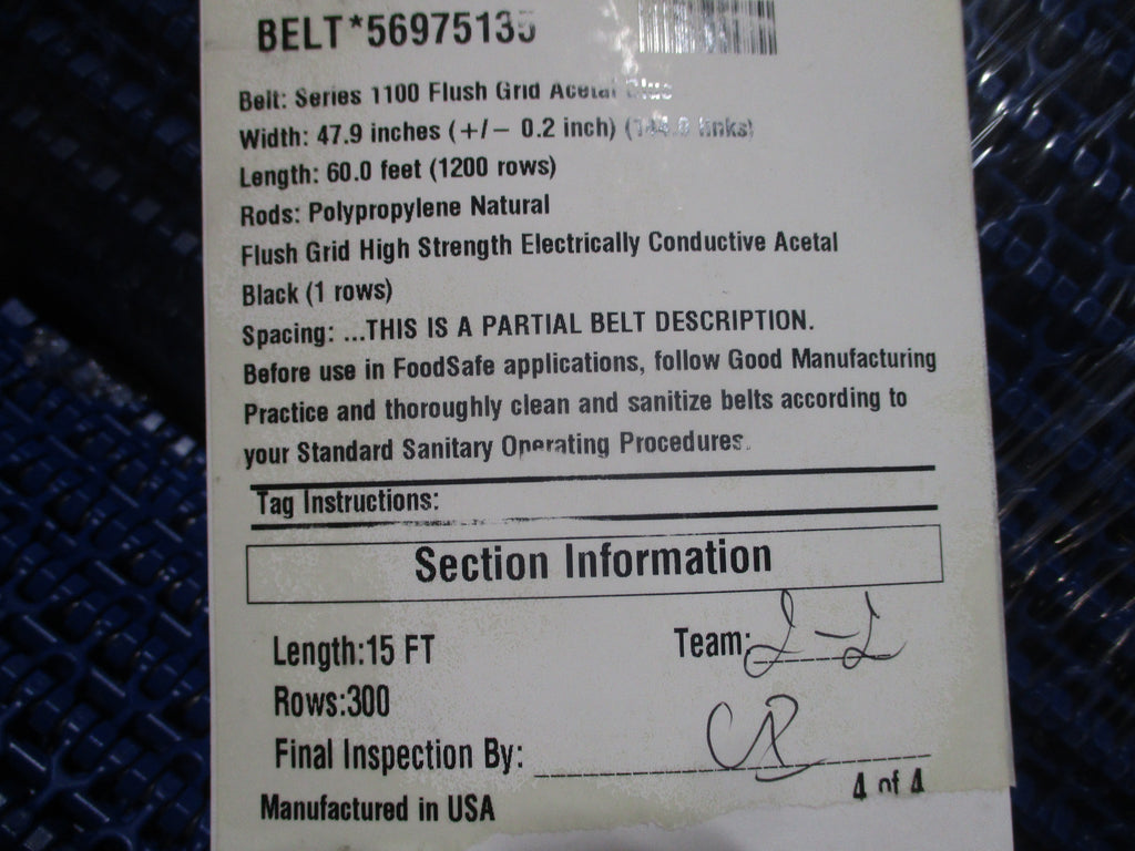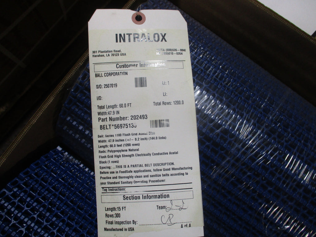 Intralox Series 1100 Flush Grid Belt 202493 / 56975135 Width: 47.9in Length: 60.0ft Acetal Blue New Surplus
