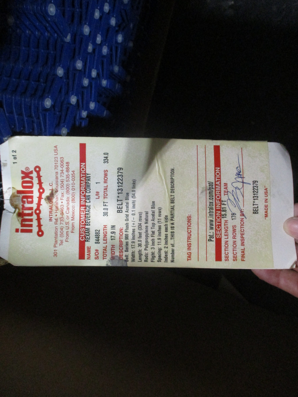 Intralox Series 900 Flush Grid Belt 31322379 Width: 17.9in Length: 30ft Acetal Blue New Surplus LOC AB11-7766 / AB35A3
