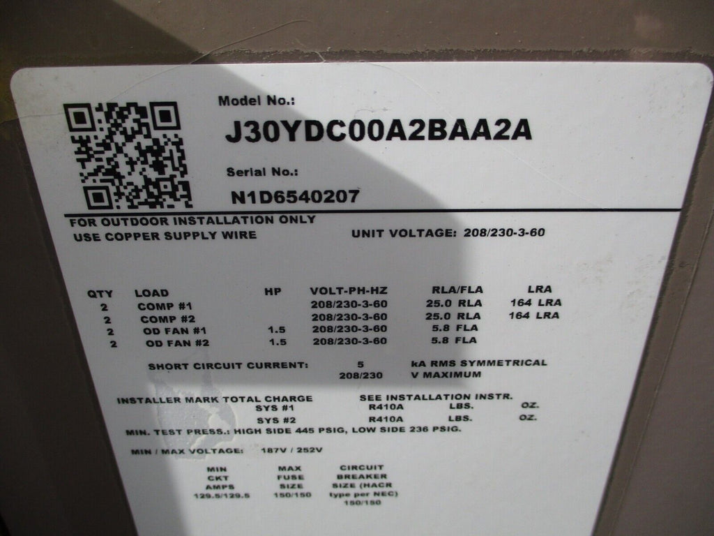 Johnson Controls Split System Condensing Unit Part #: J30YDC00A2BAA2A 30 Ton 208/230 V 3Ph MFD: 2016 *Unit Is Still Charged* Weighs: 1900 LBS Used Loc: AB11-5763