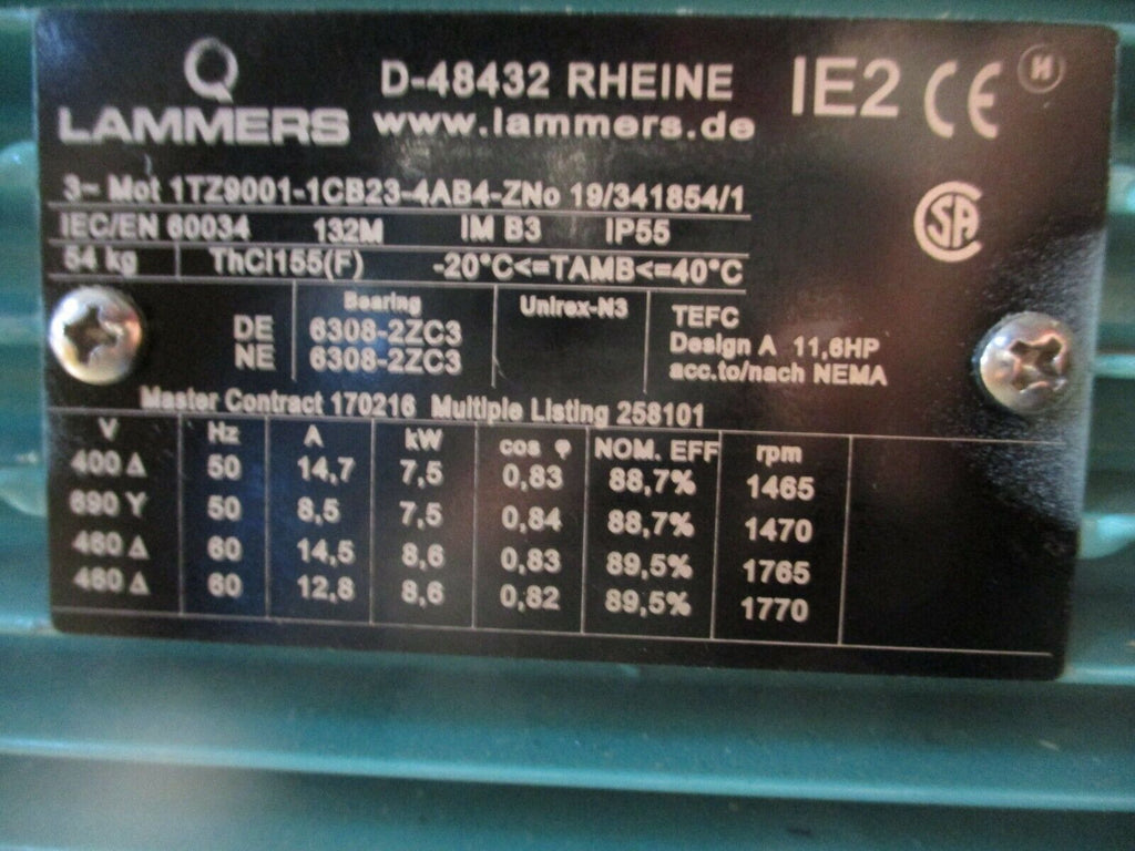 Lammers AC Motor 1TZ9001-1CB23-4AB4-Z 11.6HP 1800RPM 480V TEFC Enclosure Used