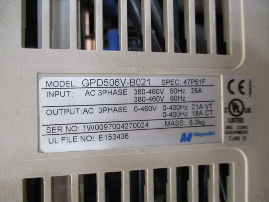 Magnetek GPD 506 AC Drive GPD506V-B021 15HP 3Ph w/ Keypad Used_x000D_ Condition: UsedBrand: MagnetekInput Voltage: 380-460 VMPN: GPD506V-B021Maximum Load: 15 HPType: General Purpose AC Drive Magnetek GPD 506 AC Drive GPD506V-B021 15HP 3Ph w/ Keypad Used Magnetek GPD 506 AC Drive Part #: GPD506V-B021 15 HP 3Ph Input:380-460 V50/60 Hz26 AOutput:0-460 V0-400 Hz21 A VT18 A CTw/ Keypad Used Loc: 27F1-4 Magnetek GPD 506 AC Drive Part #: GPD506V-B021 15 HP 3Ph Input: 380-460 V 50/60 Hz 26 A Output: 0-460 V 0-400 Hz 21 A VT 18 A CT w/ Keypad Uséd Loc: 27F1-4