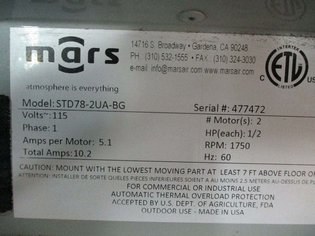 Mars Unheated Air Curtain STD78-2UA-BG 115V 1Ph 60Hz Length: 78" Used_x000D_ Condition: UsedModel: Mars STD78-2UA-BGBrand: MarsType: Air CurtainMPN: STD78-2UA-BG Mars Unheated Air Curtain STD78-2UA-BG 115V 1Ph 60Hz Length: 78" Used Mars Unheated Air Curtain Part #: STD78-2UA-BG 115V 1Ph 60Hz Length: 78" 1750RPM *Dented End* Used LOC AB11-3346 / (AB37K2) Mars Unheated Air Curtain Part #: STD78-2UA-BG 115V 1Ph 60Hz Length: 78" 1750RPM *Dented End* Uséd LOC AB11-3346 / (AB37K2)