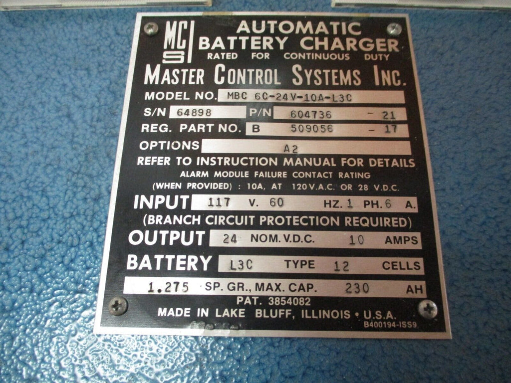 Master Control Systems Automatic Battery Charger 604736-21 Output: 24VDC 10A