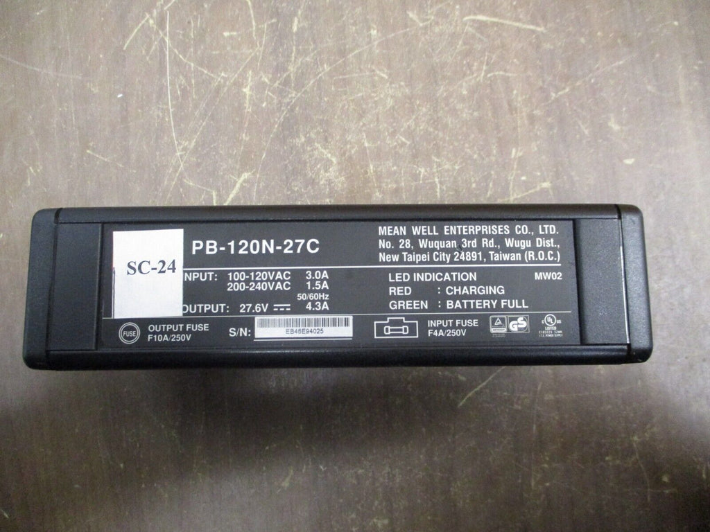 Mean Well Battery Charger PB-120N-27C Output: 27.6VDC 4.3A *No Cable* Used Condition: UsedBrand: MEAN WELLMPN: PB-120N-27C Mean Well Battery Charger PB-120N-27C Output: 27.6VDC 4.3A *No Cable* Used Mean Well Battery Charger Part #: PB-120N-27C Input:100-120 VAC, 3.0 A200-240 VAC, 1.5 A50/60 HzOutput: 27.6 VDC 4.3 A *No Cable* Used Loc: 28H5-18 Mean Well Battery Charger Part #: PB-120N-27C Input: 100-120 VAC, 3.0 A 200-240 VAC, 1.5 A 50/60 Hz Output: 27.6 VDC 4.3 A *No Cable* Uséd Loc: 28H5-18