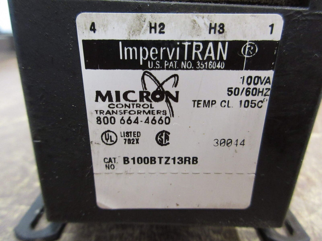 Micron ImperviTRAN Control Transformer B100BTZ13RB 100VA Pri: 240/480V 50/60Hz Micron ImperviTRAN Control Transformer Part #: B100BTZ13RB 100 VA Pri: 240/480 V Sec: 120 V 50/60 Hz Used Loc: 59F5-14