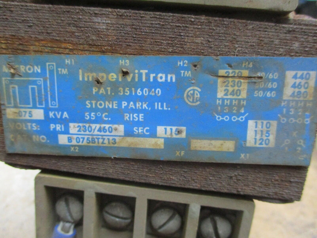 Micron ImperviTran Transformer B075BTZ13 0.075KVA Pri: 230/460V Sec: 115V Used