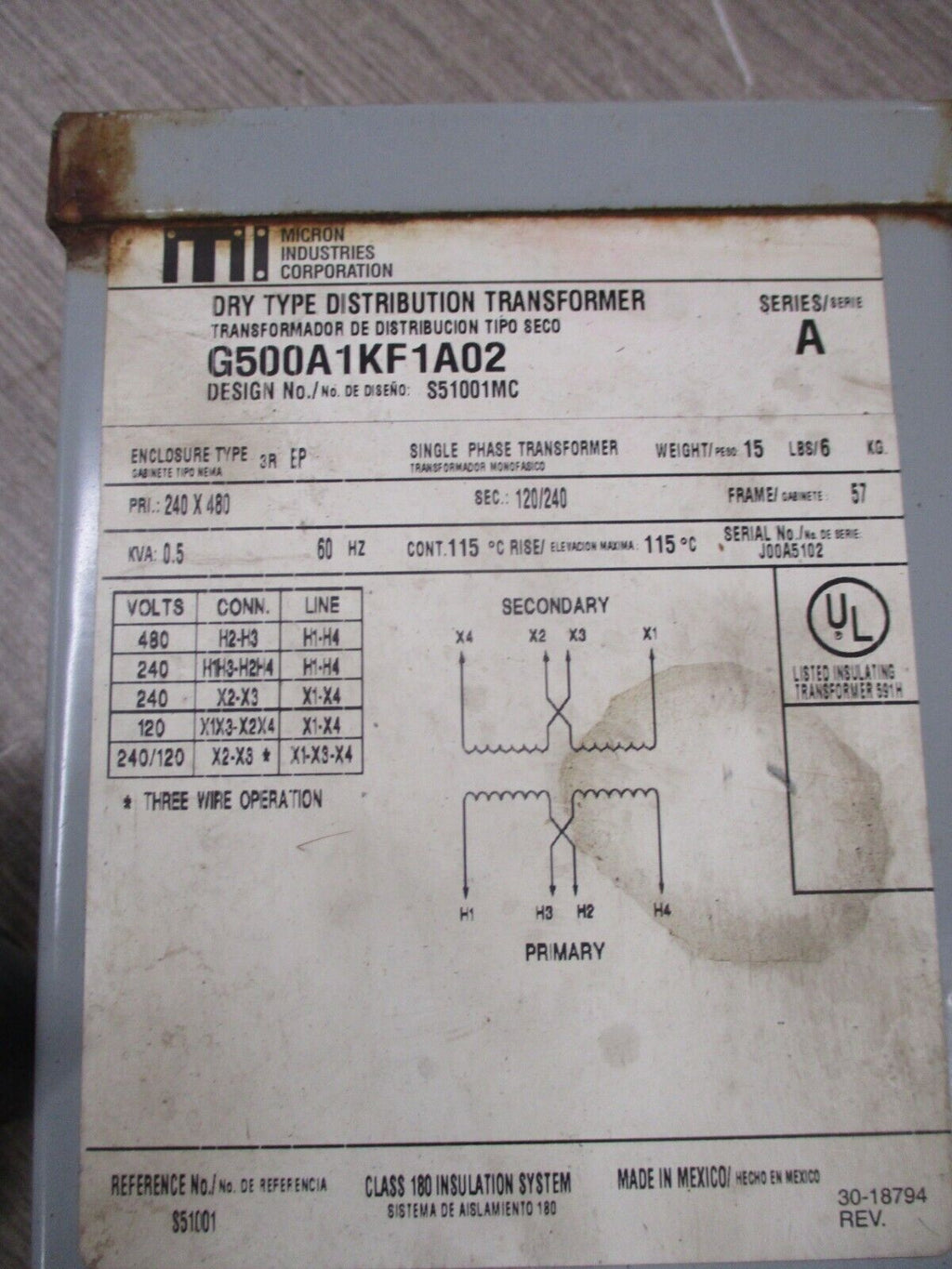 Micron Industries Transformer G500A1KF1A02 Ser. A 0.5kVA Pri: 240/480V 60Hz Used