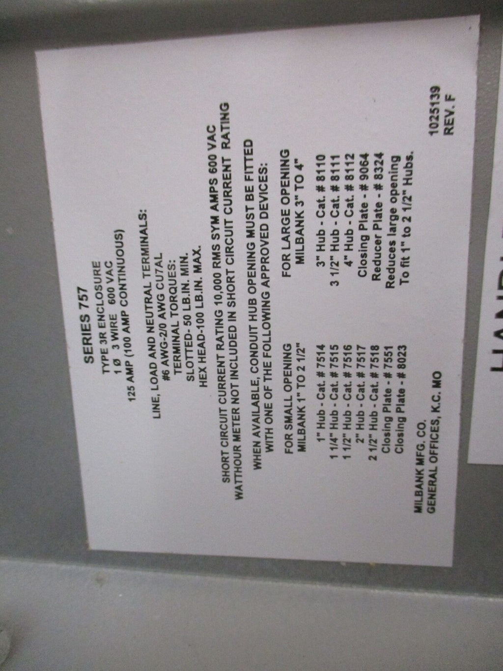 Milbank 3R Meter Socket Series 757 100A 600V 1Ph 3W Used_x000D_ Milbank 3R Meter Socket Series Part #: Series 757 100 A 600 V 1Ph 3W Used Loc: AB11-7392 / AB9N2