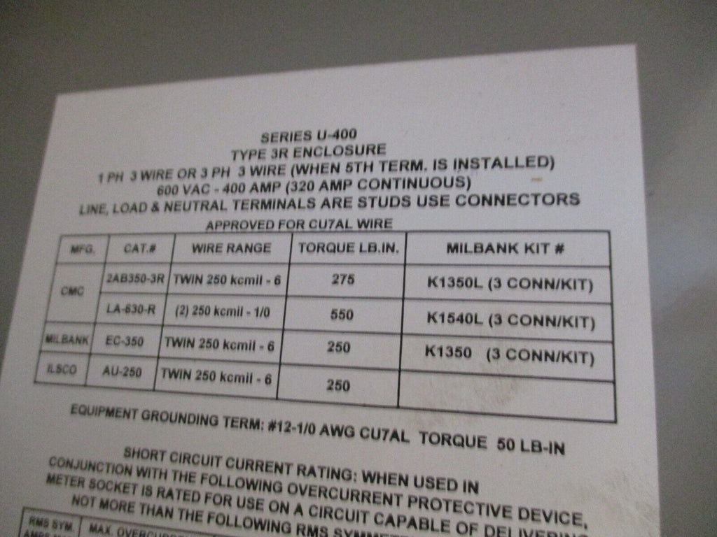Milbank 3R Meter Socket U-400 400A 600V Used Condition: UsedBox Shape: RectangularBrand: MilbankColor: GrayCurrent Rating: 351-400 AMPN: U-400Maximum Amperage: 400 AType: Meter SocketVoltage: 551-600 V Milbank 3R Meter Socket U-400 400A 600V Used Milbank 3R Meter Socket Part #: U-400 400 A 600 V Used Loc: AB11-5641 / AB2O2 Milbank 3R Meter Socket Part #: U-400 400 A 600 V Uséd Loc: AB11-5641 / AB2O2