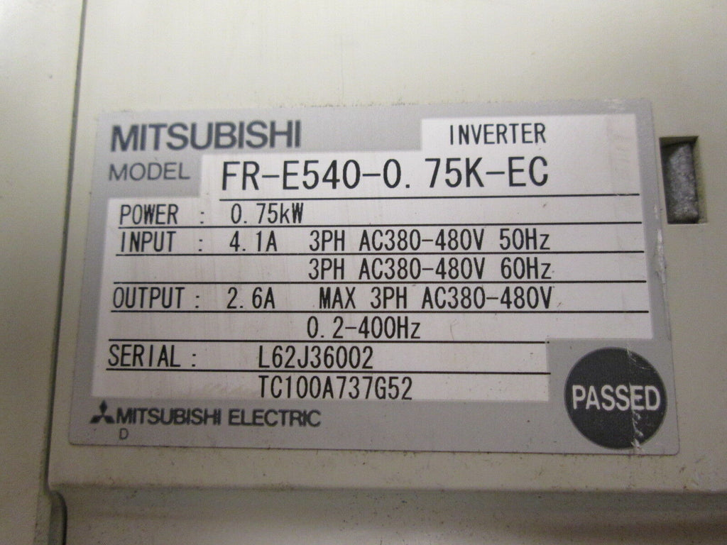 Mitsubishi E500 AC Drive w/ RFI Filter FR-E540-075K-EC 0.75KW 3Ph, Used_x000D_ Condition: UsedBrand: MitsubishiMPN: FR-E540-075K-EC Mitsubishi E500 AC Drive w/ RFI Filter FR-E540-075K-EC 0.75KW 3Ph, Used Mitsubishi E500 AC Drive w/ RFI FilterPart #: FR-E540-075K-EC 0.75KW 3PhInputs:4.1AAC380-480V 50HzAC380-480V 60HzOutputs:2.6AMAX AC380-480V0.2-400Hz*Missing Terminal Cover*UsedLOC 12I5-4 Mitsubishi E500 AC Drive w/ RFI Filter Part #: FR-E540-075K-EC 0.75KW 3Ph Inputs: 4.1A AC380-480V 50Hz AC380-480V 60Hz Outputs: 2.6A MAX AC380-480V 0.2-400Hz *Missing Terminal Cover* Used LOC 12I5-4