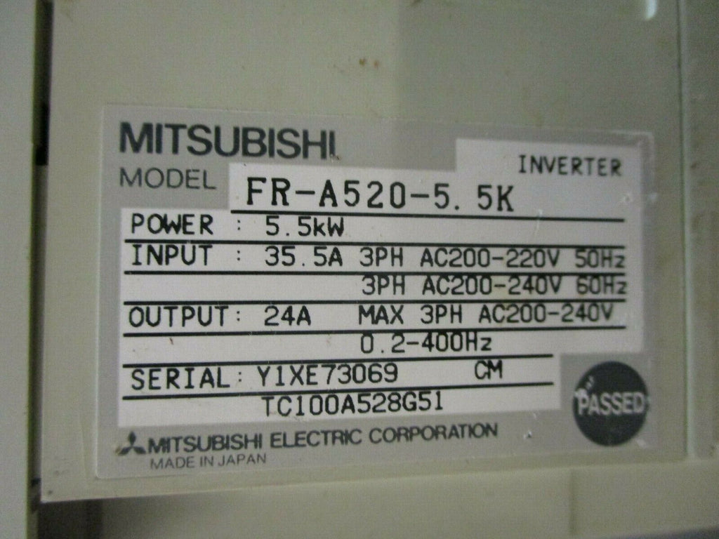 Mitsubishi Freqrol A500 AC Drive FR-A520-5.5K 5.5kW 3Ph w/ Keypad Used Condition: UsedType: General Purpose Inverter AC DriveInput Voltage: 200-240 VMPN: FR-A520-5.5KBrand: Mitsubishi Mitsubishi Freqrol A500 AC Drive FR-A520-5.5K 5.5kW 3Ph w/ Keypad Used Mitsubishi Freqrol A500 AC Drive Part #: FR-A520-5.5K 5.5 kW 3Ph Input:35.5A 3PH AC200-220V 50Hz3PH AC200-240V 60HzOutput:24 A MAX 3PH AC200-240V0.2-400Hzw/ Keypad Used Loc: 19A1-7 Mitsubishi Freqrol A500 AC Drive Part #: FR-A520-5.5K 5.5 kW 3Ph Input: 35.5A 3PH AC200-220V 50Hz 3PH AC200-240V 60Hz Output: 24 A MAX 3PH AC200-240V 0.2-400Hz w/ Keypad Uséd Loc: 19A1-7