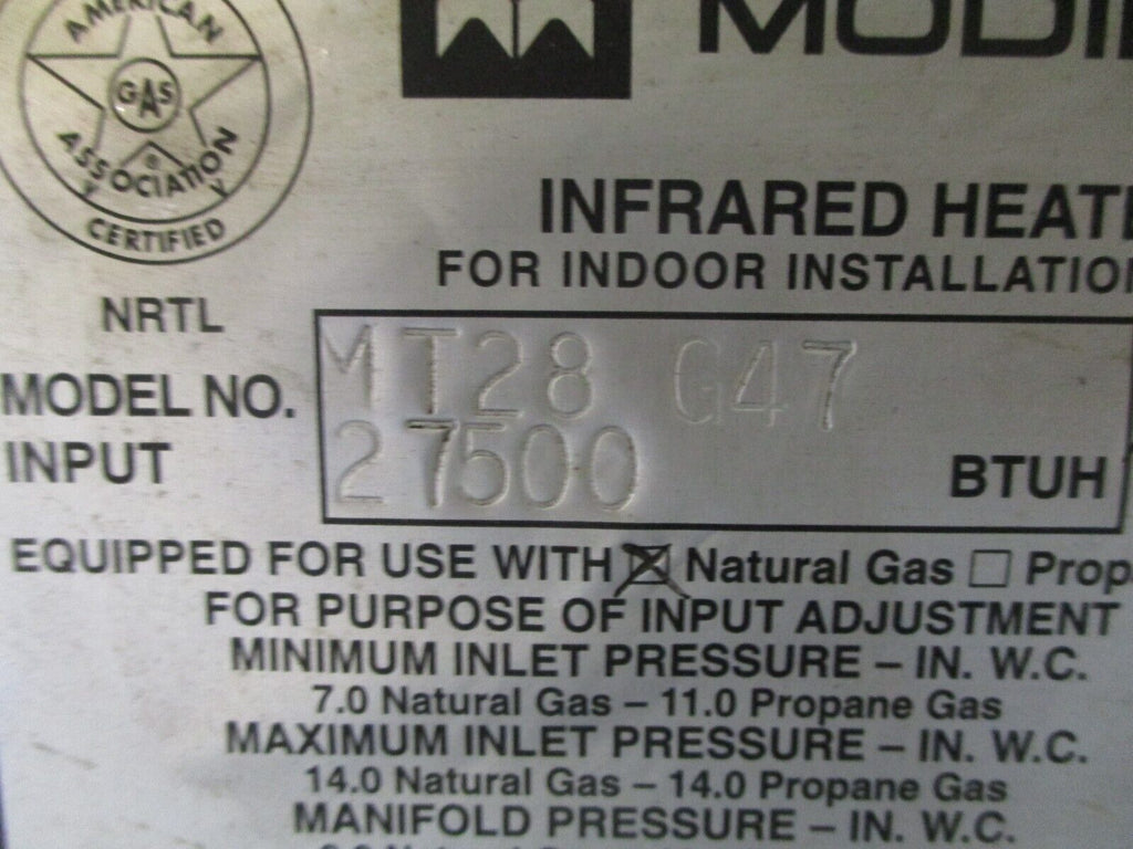 Modine Infrared Heater MT28 G47 27,500 BTUH 120VAC Natural Gas Used