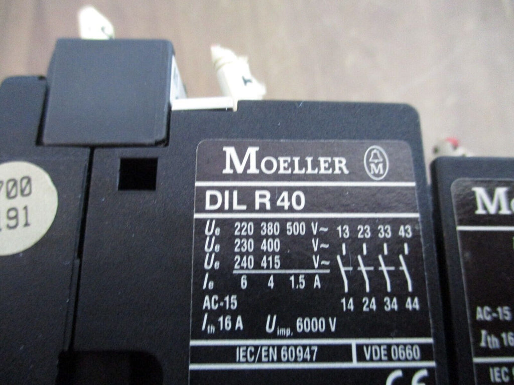 Moeller Contactor DIL R40 120V Coil 15A 600V w/ Aux Contact Block Used Condition: UsedBrand: MoellerCoil Voltage: 120 VMPN: DIL R40Maximum Amperage: 15 AType: Definite Purpose Contactor Moeller Contactor DIL R40 120V Coil 15A 600V w/ Aux Contact Block Used Moeller Contactor Part #: DIL R40 120 V Coil 15 A 600 V w/ Aux Contact Block Used Loc: 18I2-52 Moeller Contactor Part #: DIL R40 120 V Coil 15 A 600 V w/ Aux Contact Block Uséd Loc: 18I2-52