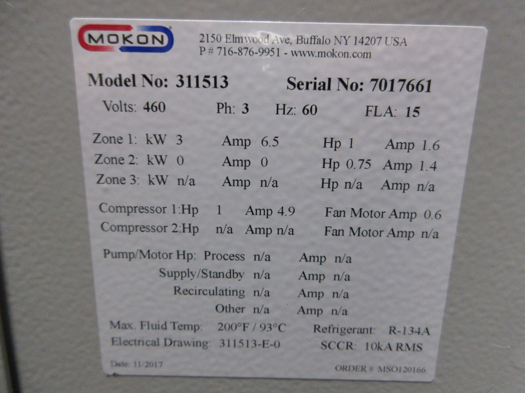 Mokon Water Temperature Control Unit Part #: 311513 3kW 460 V 3Ph 60 Hz 15 A 200°F Max Dims: 63" x 38" x 26" Weighs: 520 LBS Used Loc: AB1I1-16