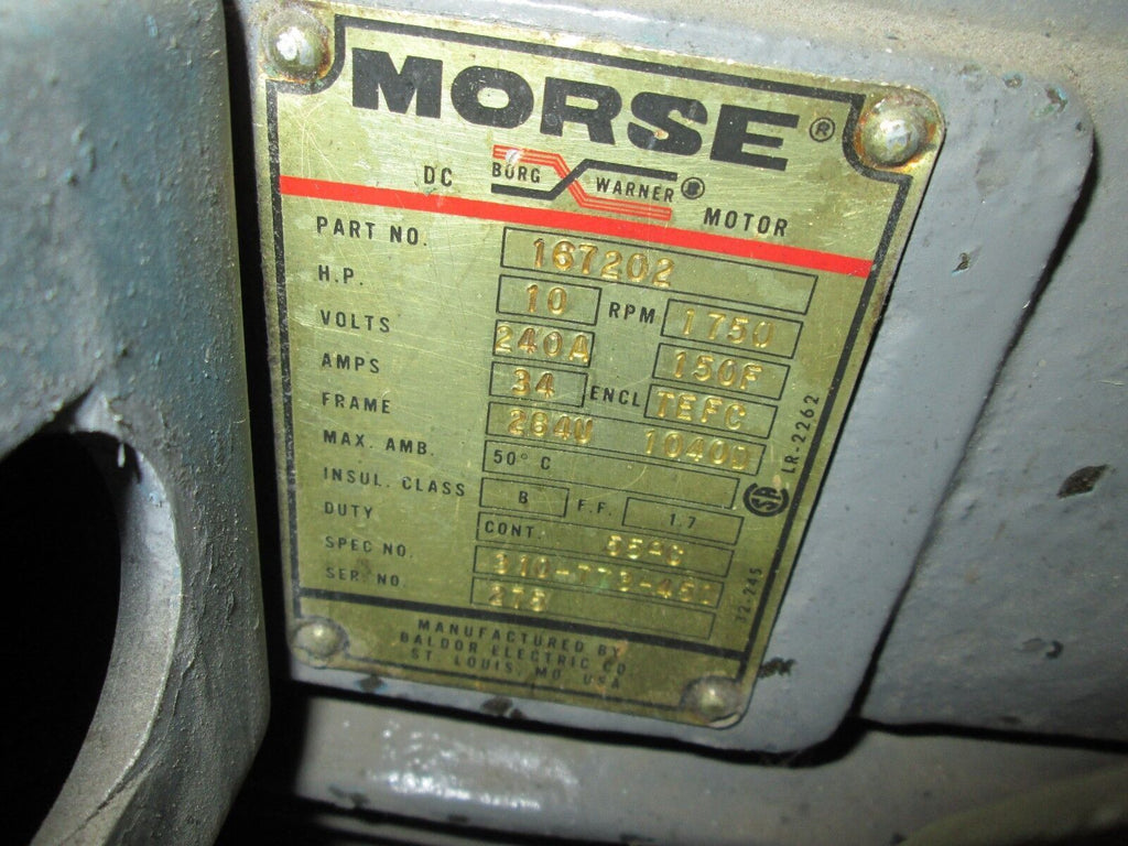 Morse Borg Warner DC Motor 167202 10HP 1750RPM 240A/150F volts 34 amps TEFC Used Condition: UsedCurrent Type: DCMPN: 167202Brand: Morse Morse Borg Warner DC Motor 167202 10HP 1750RPM 240A/150F volts 34 amps TEFC Used Morse Borg Warner DC Motor Part # 167202 10 HP 1750RPM 240A / 150F volts 34 amps TEFC enclosure UsedLOC# AB5O3-1 Morse Borg Warner DC Motor Part # 167202 10 HP 1750RPM 240A / 150F volts 34 amps TEFC enclosure Uséd LOC# AB5O3-1