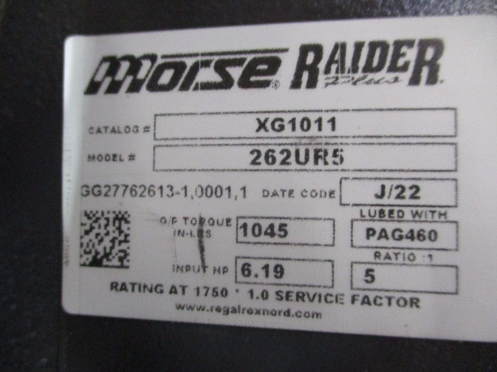 Morse Raider Plus Reducer XG1011 Model #: 262UR5 Ratio 5:1 6.19HP 1750 RPM In Morse Raider Plus Reducer Part #: XG1011 Model #: 262UR5 Ratio 5:1 6.19 HP 1045 In-Lbs Torque1750 RPM In *No Box* New Surplus Loc: AB11-5647 / AB2E1 Morse Raider Plus Reducer Part #: XG1011 Model #: 262UR5 Ratio 5:1 6.19 HP 1045 In-Lbs Torque1750 RPM In *No Box* New Surplus Loc: AB11-5647 / AB2E1