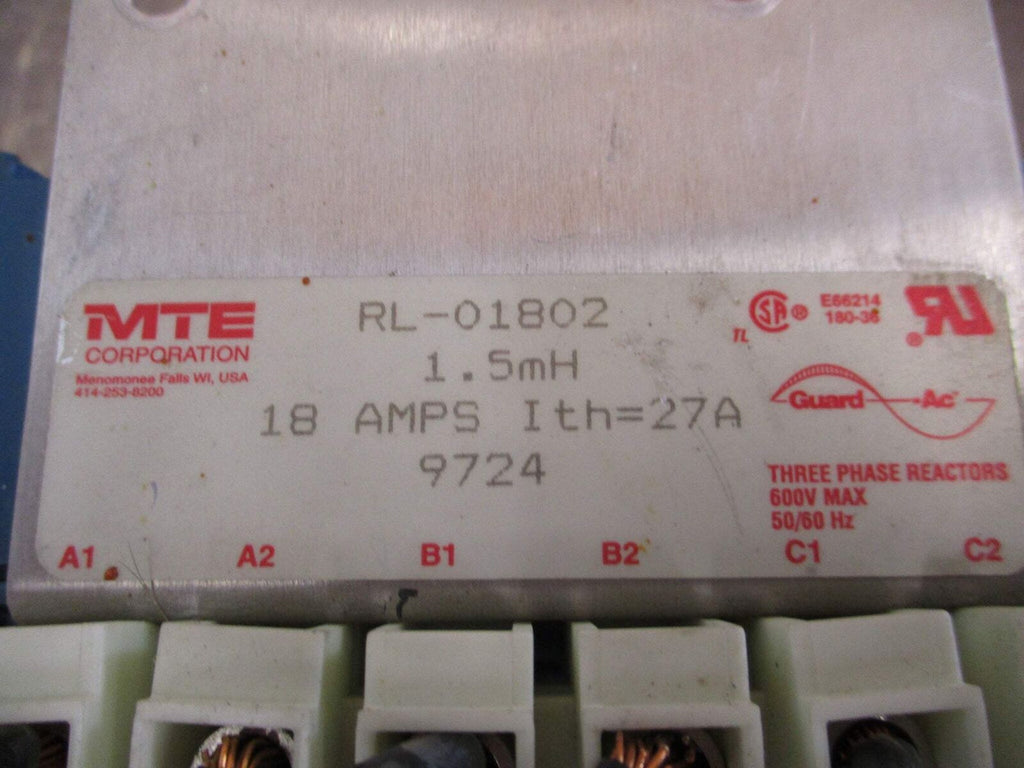 MTE Line Reactor RL-01802 1.5mH 18A 600V 50/60Hz Used MTE Line Reactor Part #: RL-01802 1.5mH 18 A 600 V 50/60 Hz Used Loc: 59B1-5