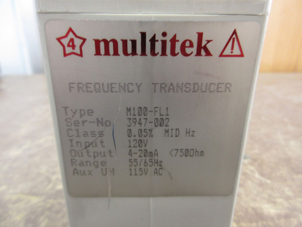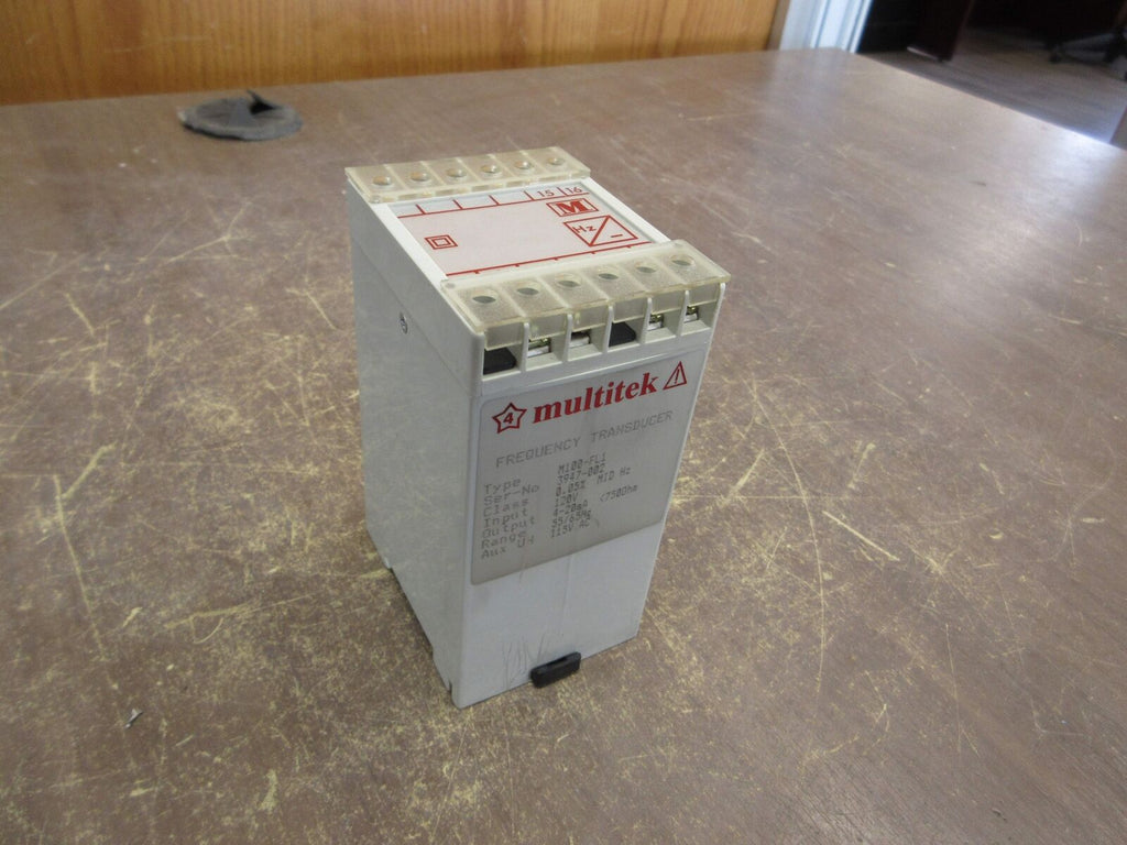 Multitek Frequency Transducer M100-FL1 Input: 120V Output: 4-20mA 55-65Hz Used Multitek Frequency Transducer Part #: M100-FL1 Input: 120 V Output: 4-20mA 55-65 Hz Used Loc: 59G2-21