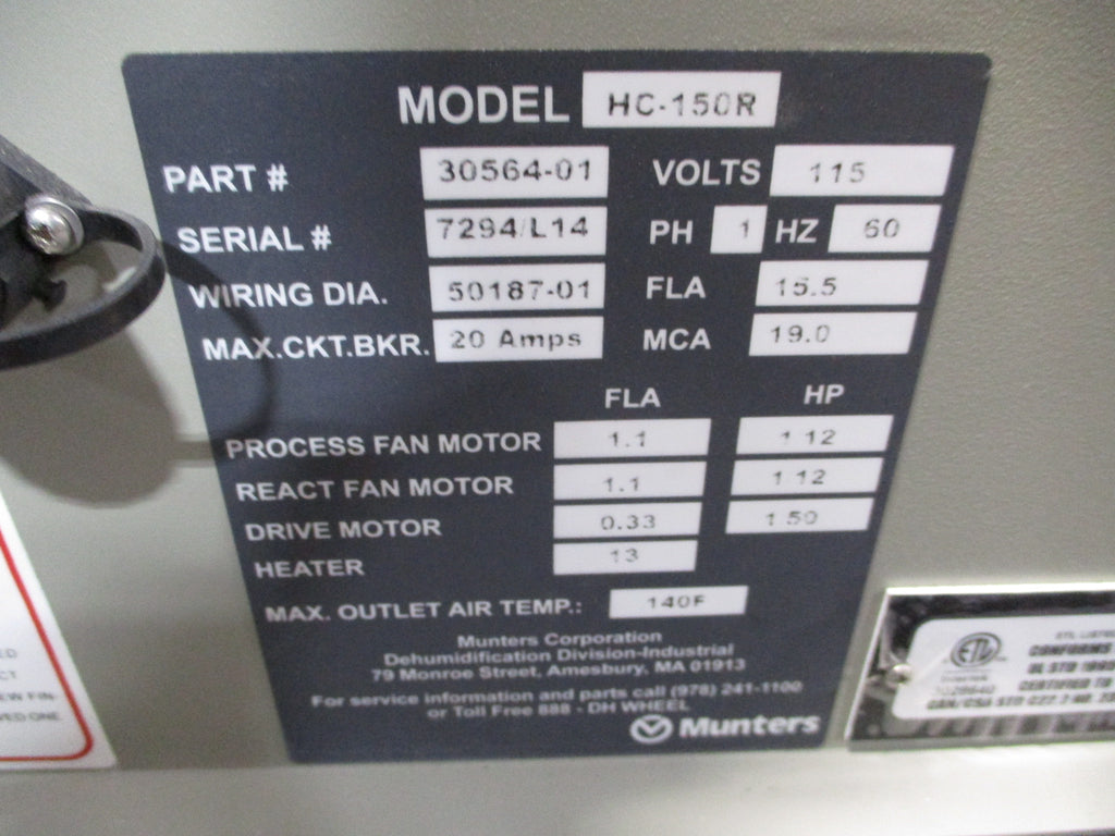 Munters HC-150R Desiccant Dehumidifier 30564-01 115V 1Ph 60Hz Used
