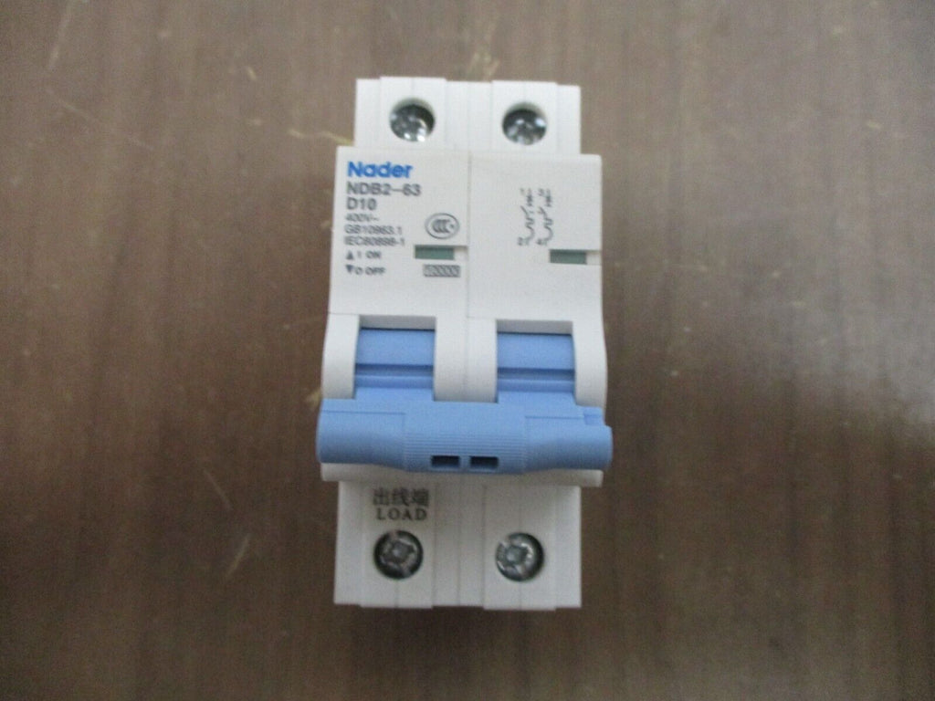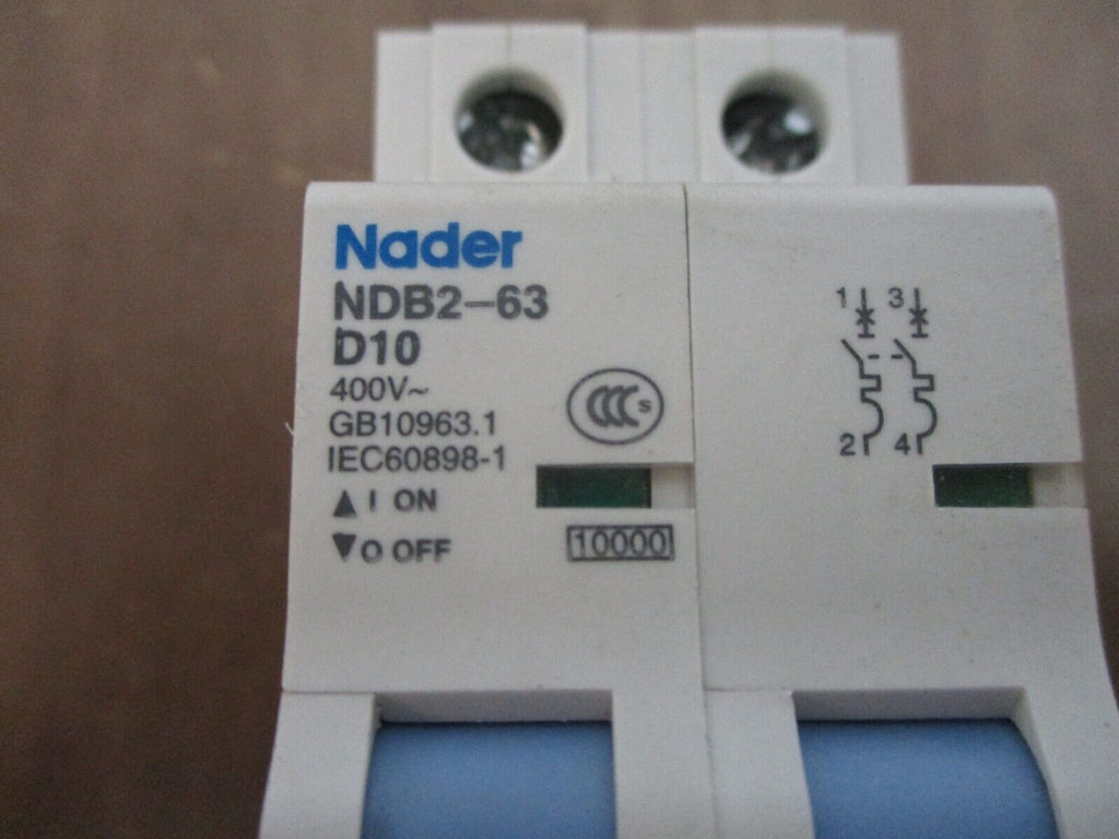 Nader Circuit Breaker NDB2-63D10 10A 400V 2P Used Condition: UsedBrand: NaderMaximum Amperage: 10 AMPN: NDB2-63D10 Nader Circuit Breaker NDB2-63D10 10A 400V 2P Used Nader Circuit Breaker Part #: NDB2-63D10 10 A 400 V 2P Used Loc: 17F3-35 Nader Circuit Breaker Part #: NDB2-63D10 10 A 400 V 2P Uséd Loc: 17F3-35