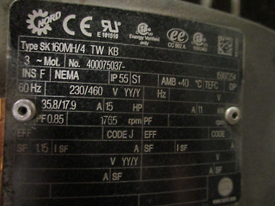 Nord Drive Systems Gearmotor Type SK160MH/4 TWKB 230/460V 60HZ 15HP 1800RPM Used_x000D_ Condition: UsedBrand: NordBase RPM: 1800 RPMNominal Rated Input Voltage: 460 VMPN: Type SK 160MH/4 TW KB Nord Drive Systems Gearmotor Type SK160MH/4 TWKB 230/460V 60HZ 15HP 1800RPM Used Nord Drive Systems GearMotorPart #: Type SK160MH/4 TW KB230/460V60 HZ15HP1765 RPMUsedLoc : AB11-6574 / AB9H1 Nord Drive Systems GearMotor Part #: Type SK160MH/4 TW KB 230/460V 60 HZ 15HP 1765 RPM Uséd Loc : AB11-6574 / AB9H1