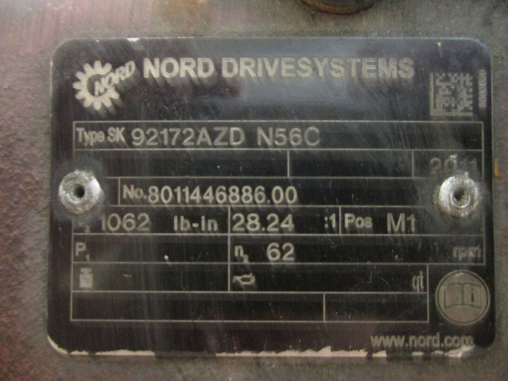 Nord Gear Reducer SK 92172AZD N56C Ratio 28.24:1 1062 lb-In 62 RPM Out Used_x000D_ Condition: UsedNominal Ratio: 28.24:1MPN: SK 92172AZD N56CBrand: NordType: Gear Reducer Nord Gear Reducer SK 92172AZD N56C Ratio 28.24:1 1062 lb-In 62 RPM Out Used Nord Gear Reducer Part#: SK 92172AZD N56C Ratio 28.24:1 1062 lb-In 62 RPM Out Used Loc: AB11-2605 / AB8O2 Nord Gear Reducer Part#: SK 92172AZD N56C Ratio 28.24:1 1062 lb-In 62 RPM Out Uséd Loc: AB11-2605 / AB8O2
