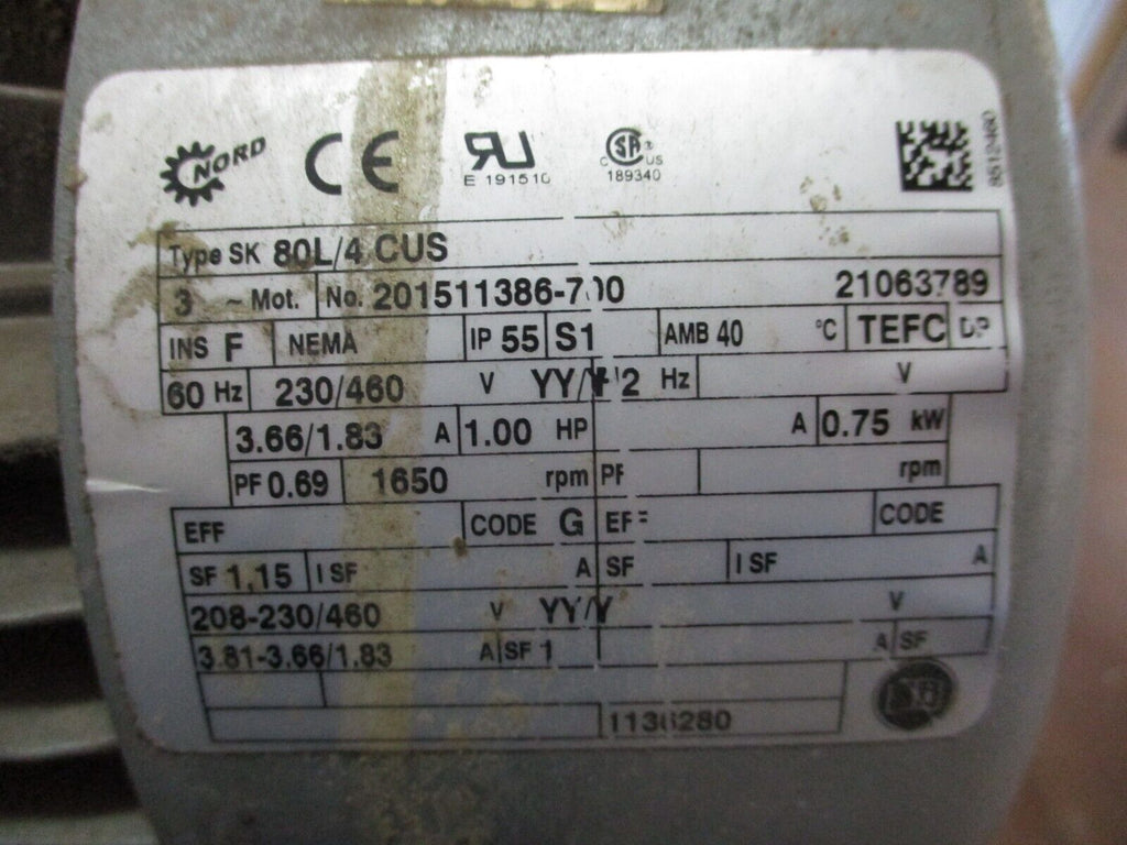 Nord Gearmotor Type SK 80L/4 CUS 1HP 1800RPM 230/460V 3.66/1.83A 60Hz Used_x000D_ Condition: UsedActual Rated Input Voltage: 230/460 VBase RPM: 1800 RPMBrand: NordEnclosure Type: TEFC (Totally Enclosed Fan Cooled)Full Load Amps: 3.66/1.83 AGear Ratio: 6.58:1IP Rating: IP55Insulation Class: F (Max 311°F)MPN: Type SK 80L/4 CUSNominal Rated Input Voltage: 230/460 VRated Load (HP): 1 Nord Gearmotor Type SK 80L/4 CUS 1HP 1800RPM 230/460V 3.66/1.83A 60Hz Used Nord Gearmotor Part #: Type SK 80L/4 CUS 1 HP 1650 RPM 230/460 V 3.66/1.83 A 60 Hz Used Loc: AB11-5573 / AB12J2 Nord Gearmotor Part #: Type SK 80L/4 CUS 1 HP 1650 RPM 230/460 V 3.66/1.83 A 60 Hz Uséd Loc: AB11-5573 / AB12J2