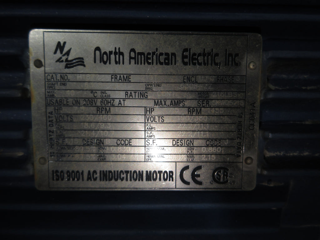 North American Electric AC Induction Motor Part #: H1872 7.5 HP 1775 RPM 18.6/9.3 A 50/60 Hz 3Ph Frame: 213T TEFC Enclosure Dims: 20" x 17" x 15" Weighs: 225 LBS Used Loc: AB11-9210 / AB31D3