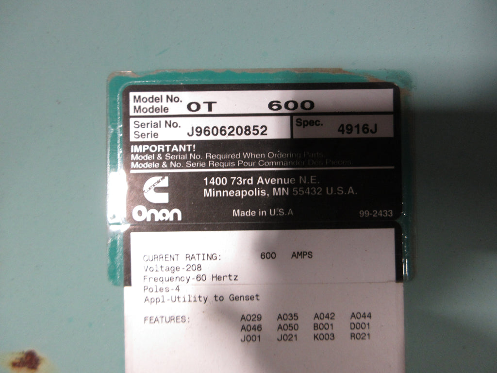 Onan Automatic Transfer Switch OT 600 600A 208V 60Hz 4P Used