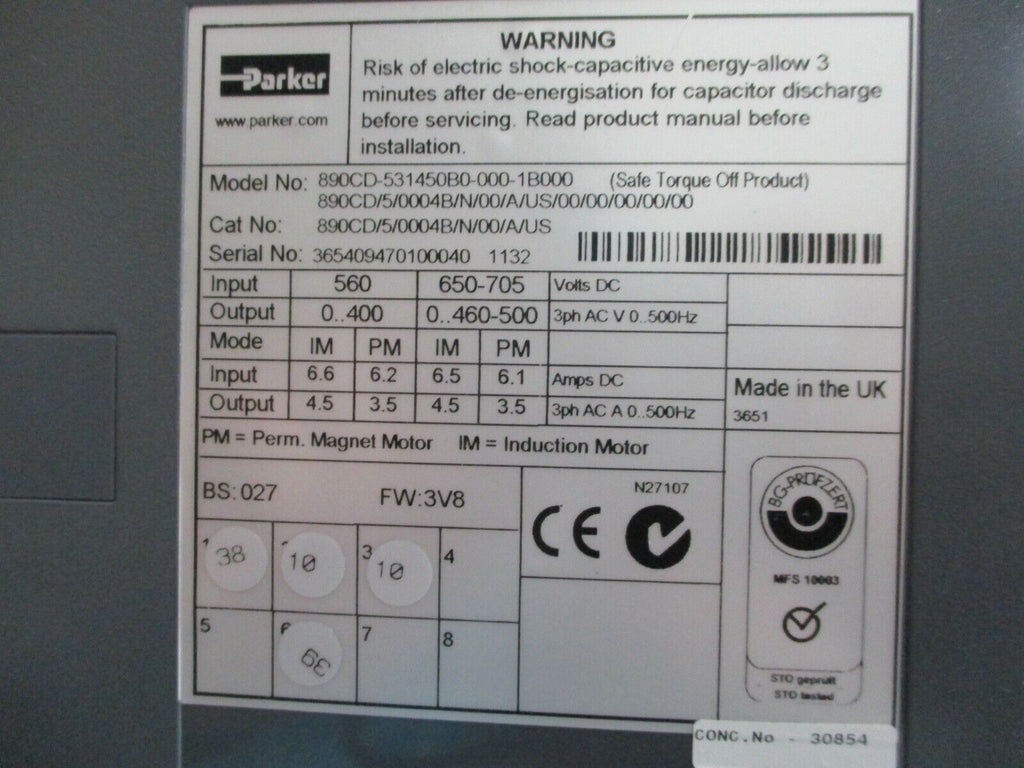 Parker Common DC Bus Drive 890CD/5/0004B/N/00/A/US FW: 3V8 Used Condition: UsedMPN: 890CD/5/0004B/N/00/A/USBrand: Parker Parker Common DC Bus Drive 890CD/5/0004B/N/00/A/US FW: 3V8 Used Parker Common DC Bus Drive Part #: 890CD/5/0004B/N/00/A/US Model #: 890CD-531450B0-000-1B0002HPInput:560V / 650-705V6.6AOutput:0..400V / 0..460-500V0..500Hz4.5AFW: 3V8 3PhUsedLOC AB7E2-22 Parker Common DC Bus Drive Part #: 890CD/5/0004B/N/00/A/US Model #: 890CD-531450B0-000-1B000 2HP Input: 560V / 650-705V 6.6A Output: 0..400V / 0..460-500V 0..500Hz 4.5A FW: 3V8 3Ph Uséd LOC AB7E2-22