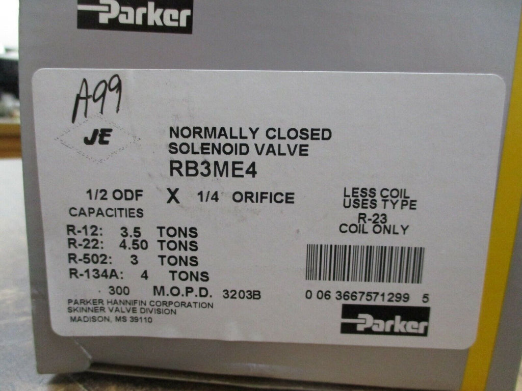 Parker Solenoid Valve Part #: RB3ME4 Normally Closed 1/2" ODF x 1/4" Orifice New SurplusLOC 12E3-30- Part #: RB3ME4