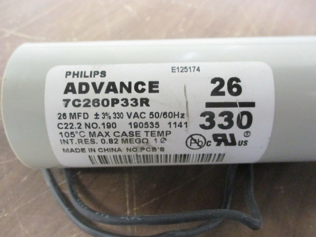 Philips Advance Capacitor 7C260P33R 26MFD 330VAC 50-60Hz Used Condition: UsedBrand: PhilipsMPN: 7C260P33R Philips Advance Capacitor 7C260P33R 26MFD 330VAC 50-60Hz Used Philips Advance CapacitorPart #: 7C260P33R 26MFD 330VAC 50-60Hz UsedLOC 10F4-26 Philips Advance Capacitor Part #: 7C260P33R 26MFD 330VAC 50-60Hz Uséd LOC 10F4-26