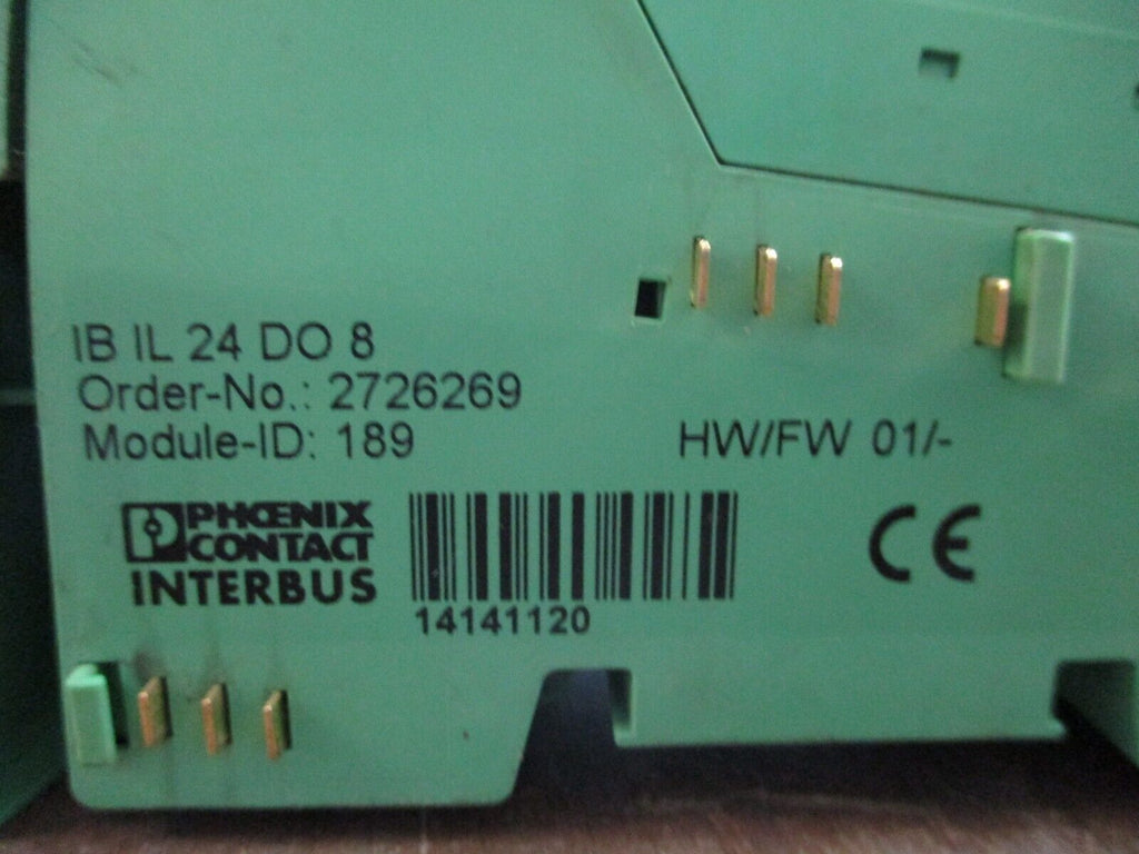 Phoenix Contact IBIL24DO8 Interbus Coupler 2726269 HW: 01 w/ Terminal Cover Used Condition: UsedBrand: Phoenix ContactMPN: 2726269Type: Interbus Coupler Phoenix Contact IBIL24DO8 Interbus Coupler 2726269 HW: 01 w/ Terminal Cover Used Phoenix Contact IBIL24DO8 Interbus Coupler Part #: 2726269 HW: 01 w/ Terminal Cover*Broken Latch Clip*Used Loc: 14H4-103 Phoenix Contact IBIL24DO8 Interbus Coupler Part #: 2726269 HW: 01 w/ Terminal Cover *Broken Latch Clip* Uséd Loc: 14H4-103