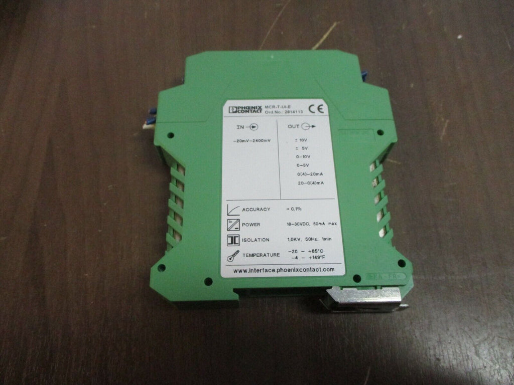 Phoenix Contact MCR-T-UI-E Temperature Transducer 2814113 24VDC Used Condition: UsedMPN: 2814113Brand: Phoenix ContactType: Temperature Transducer Phoenix Contact MCR-T-UI-E Temperature Transducer 2814113 24VDC Used Phoenix Contact MCR-T-UI-E Temperature Transducer Part #: 2814113 24 VDC Used Loc: 19I5-26 Phoenix Contact MCR-T-UI-E Temperature Transducer Part #: 2814113 24 VDC Uséd Loc: 19I5-26