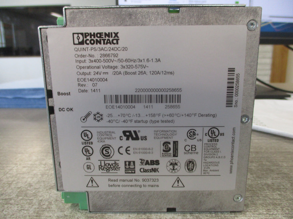 Phoenix Contact Power Supply 2866792 Rev.07 QUINT-PS/3AC/24DC/20 Input:3x400-500V / 50-60Hz / 3x1.6-1.3A Output: 24V / 20A (Boost 26A; 120A/12ms Used