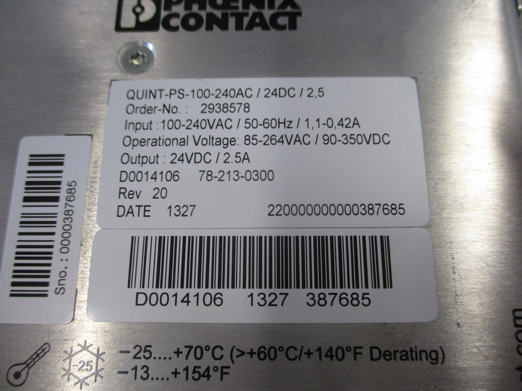 Phoenix Contact Power Supply 2938578 QUINT-PS-100-240AC/24DC/2,5 Rev. 20 Input: 100-240VAC 50-60Hz 1,1-0,42A Output: 24VDC 2.5A Used LOC 56E3-17