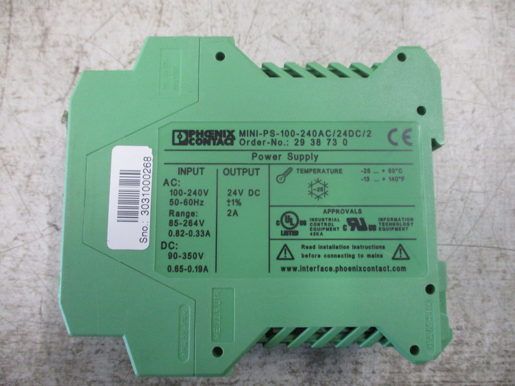 Phoenix Contact Power Supply 2938730 MINI-PS-100-240AC / 24DC / 2 Input: AC: 100-240V / 50-60Hz DC: 90-350V / 0.65-0.19A Output: 24V DC 2A Used LOC 58H3-21
