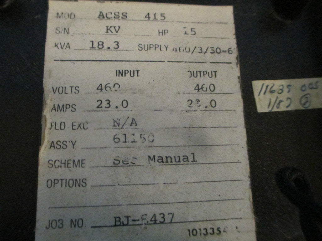 Ratiotrol Soft Start ACSS 415, 15HP, 18.3KVA, 23A 460V Condition: UsedBrand: RatiotrolMPN: ACSS 415 Ratiotrol Soft Start ACSS 415, 15HP, 18.3KVA, 23A 460V Ratiotrol Soft Start Part # ACSS 415 15HP 18.3KVA Input 23A 460V Output 23A 460V Used Loc 1B4-15 Ratiotrol Soft Start Part # ACSS 415 15HP 18.3KVA Input 23A 460V Output 23A 460V Uséd Loc 1B4-15